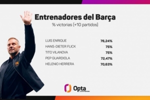 弗里克带队巴萨44场取33胜,胜率75%队史仅次恩里克